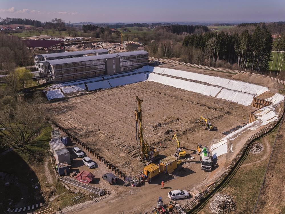 Aufgrund der unterschiedlichen und schlechten Bodenverhältnisse wurden im Vorfeld der eigentlichen Gründungsarbeiten Zugprüfungen an 16 Probepfählen durchgeführt. „Anhand der Ergebnisse konnten Länge und Anzahl der veranschlagten Mikropfähle den Anforderungen des Untergrundes angepasst werden“, so Michael Doll weiter. Auf dem Baufeld wurden kiesige bis weiche bzw. breiige Bodenverhältnisse angetroffen. Des Weiteren erforderten Findlinge in unterschiedlichen Tiefen, die nicht durchörtert werden konnten, eine schnelle Reaktion: „Bei Bedarf mussten die Steine geborgen oder aber das Pfahlraster umgeplant werden.“ Durch das enge Ausführungsraster von 3,2 m musste die Produktionsreihenfolge zudem genau geplant und abgestimmt werden, sodass sich für das eingesetzte Bohrgerät, eine BAUER BG 20 H, keine Behinderung des Bohrfortschritts und -ablaufs durch bereits eingestellte GEWI®s ergab. Die Arbeiten seitens Bauer wurden Ende März mit insgesamt 6.072 m an ausgeführten Bohrungen erfolgreich abgeschlossen.