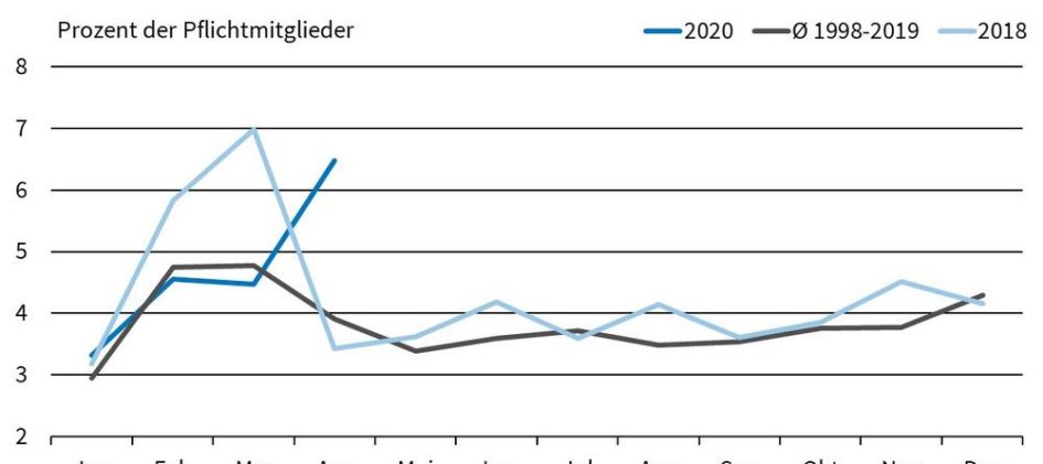 Der Krankenstand bei den Pflichtmitgliedern in der gesetzlichen Krankenkasse ist im April in der Coronakrise deutlich gestiegen. „Er lag mit 6,5 Prozent viel höher als der Durchschnitt der Aprilmonate der Jahre 1998 bis 2019, der 3,9 Prozent betrug“, sagt Timo Wollmershäuser, der Leiter der Konjunkturforschung beim ifo Institut unter Berufung auf Zahlen des Bundesministeriums für […]