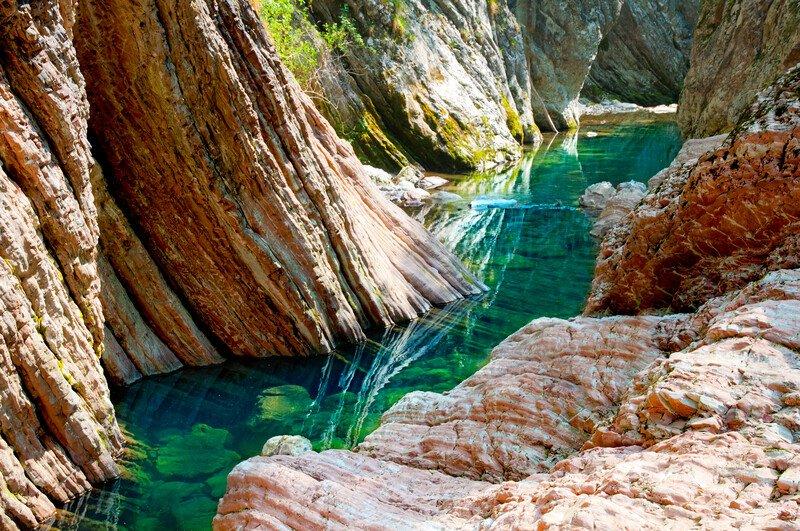 In den Wadis des Omans locken malerisch zwischen Felsen eingefräste Becken zur Erfrischung im grünen, kristallklarem Wasser. Weniger bekannt als die Wasseroasen im fernen Orient sind die Badestellen in der Breggia Schlucht im Tessin, die zwischen besonderen Felsformationen türkisgrün leuchten. Der Parco Gole della Breggia ist ein besonderer Ort und der erste Geo-Park der Schweiz. Die vom Fluss Breggia freigelegten Gesteinsschichten dokumentieren fast lückenlos einen Zeitbogen von weit über hundert Millionen Jahren, was im Alpenraum einmalig ist. In die 1,5 Kilometer lange Schlucht im unteren Muggiotal führt ein Weg, auf dem sich unterwegs zahlreiche Spuren der Ur-Meere finden: Felsschichten mit Fossilien, Reste von unterseeischen Lawinen und Vulkanausbrüchen. Und dazwischen gibt es immer wieder tiefe Gumpen die zu Badepausen einladen.