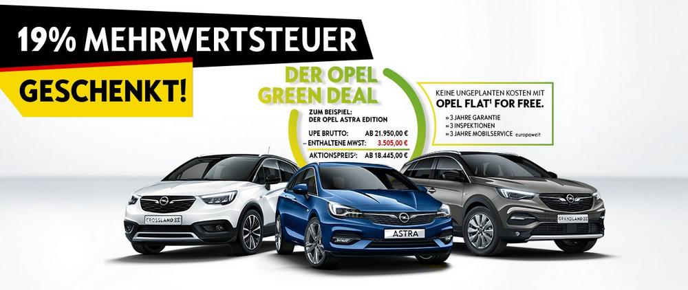 Opel hält seine Kunden mobil. Denn ab sofort schenkt der Hersteller im Rahmen des „Opel Green Deal“ den Privatkäufern eines sofort verfügbaren Blitz-Modells beim Barkauf die komplette Mehrwertsteuer. So verkürzt Opel den Autofahrern die Wartezeit, bis die von der Bundesregierung im Konjunkturpaket beschlossenen Maßnahmen gelten. Sprich: Wer sich im Juni für ein sofort lieferbares Pkw-Modell aus dem Opel-Bestand entscheidet, zahlt nur den Nettopreis und spart so mehrere Tausend Euro1. Zusätzlich kommen die Käufer in den Genuss der „Opel Flat for free“2: Das Rundum-sorglos-Paket für Bestandsfahrzeuge schützt vor ungeplanten Kosten und umfasst 3 Jahre Garantie, bis zu 3 Inspektionen in 3 Jahren gemäß Opel-Serviceplan und 3 Jahre Mobilservice.