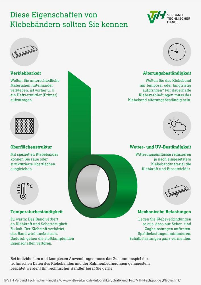 Um die Beratungs- und Servicequalität hoch zu halten, haben sich Technische Händler in der Fachgruppe „Klebtechnik“ im VTH Verband Technischer Handel e.V. zusammengeschlossen. Ausdruck dessen sind auch neue Infografiken. Sie bündeln das Wissen der Fachhändler zu den wichtigsten Eigenschaften von Klebebändern. Zudem führen sie Ratschläge zur Verarbeitung vor Augen.