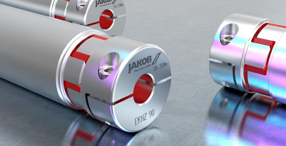 Außer den Verbindungswellen der Reihen WDS, WDE und WD-VA bietet Jakob noch eine weitere Standardbaureihe und kundenspezifische Lösung für die Überbrückung großer Achsabstände an: Die auf Elastomerkupplungen der Reihe EKH basierende Reihe EKHZ. Der Einsatzbereich der Reihe EKHZ liegt hauptsächlich in Anwendungen mit mittleren Betriebsdrehzahlen. Sie deckt einen Drehmomentbereich von 20 bis 1600 Nm ab und erlaubt maximale Drehzahlen von 3500 U/min bei der minimalen Länge von 50 cm. Sie eignet sich für Wellendurchmesser von 10 bis 100 mm. Allgemein beträgt die erreichbare maximale Länge der Reihe EKHZ drei Meter. Die Reihe EKHZ erlaubt es, Schwingungen effizient abzubauen. Der Grad der Schwingungsdämpfung lässt sich durch die Shorehärte der Ausgleichselemente anpassen. Die verwendeten Kunststoffsterne bieten zwei Vorteile: auch ohne Halbschalenausführung lassen sich die Kupplungen, da steckbar, einfach montieren. Zudem wirkt der Kunststoff thermisch und elektrisch isolierend. Aufgrund der Eigenschaften des verwendeten Materials können diese Kupplungen nur bis 90°C eingesetzt werden, wobei sich das zulässige Übertragungsdrehmoment mit zunehmender Temperatur reduziert.