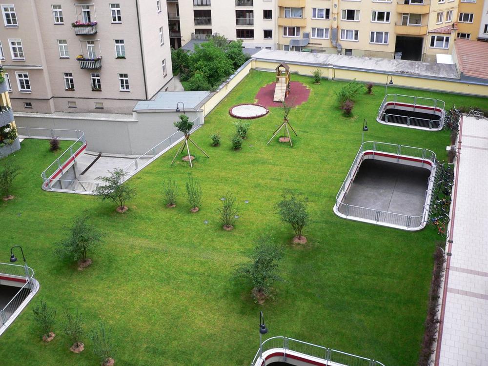 Lush vegetation, pathways and terraces, sport and playground areas and also fire service entrances or helipads can be installed just as easily on the roof of an underground car park or a courtyard with a cellar, both in commercial and residential complexes, provided their structural load reserve is sufficient. Impermeable concrete slabs that do not require a waterproof membrane are frequently used when building underground car parks. They also do not require root protection as the slabs are root-resistant in themselves. Other types of construction, for example, a courtyard over a cellar requires a root-resistant and waterproof membrane, which must be protected. This is a top priority as the underground car park roofs and courtyards that are often at ground level and therefore well accessible are frequently used for wheel loaders and for storing materials. Apart from the necessary protection function, depending on the type of building, system build-ups for underground car parks must also provide a drainage function. Substrate depths of only 40 to 60 cm or less are typical, but ponding is never good for plants. It should be at least 20 cm in the case of a lawn. Small trees require at least 60 cm – the purely mineral Zincolit-Plus is inserted as a sub-substrate (for structural stability/ventilation) beneath the required ZinCo system substrate with organic elements (upper substrate for water storage and nutrient supply).