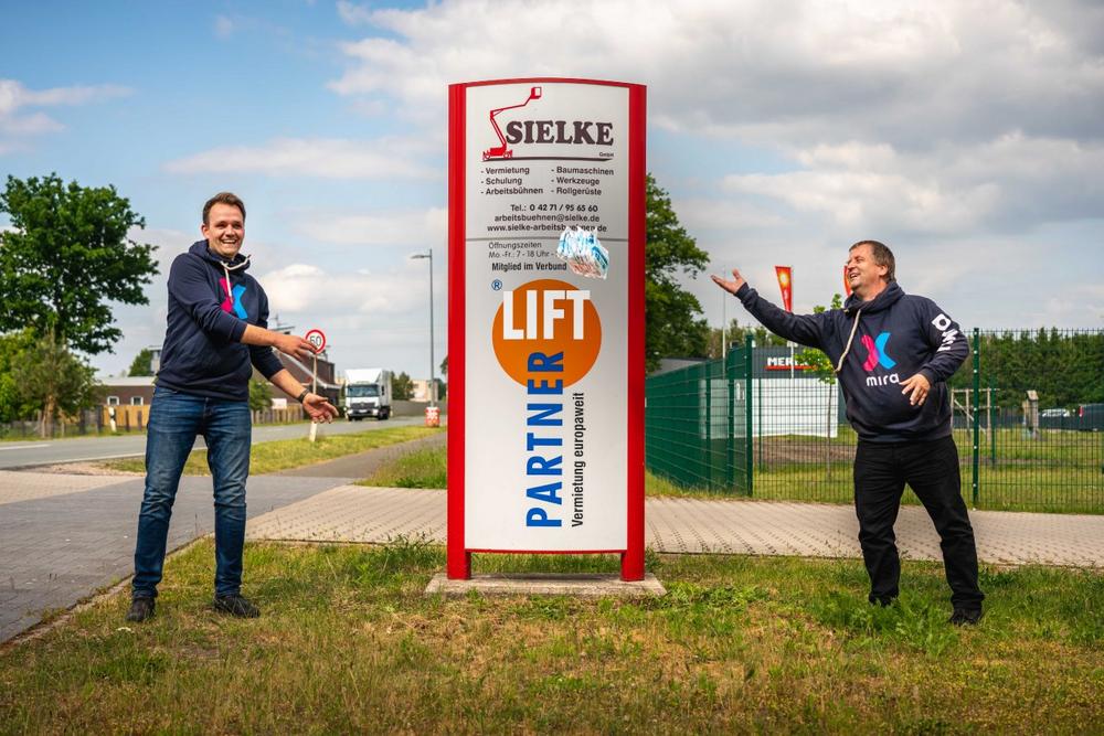 Die Herausforderung, bei der Übergabe der Masken den Mindestabstand zu wahren, konnte gemeinsam mit Steffen Sielke von der Fa. Sielke Arbeitsbühnen gemeistert werden.