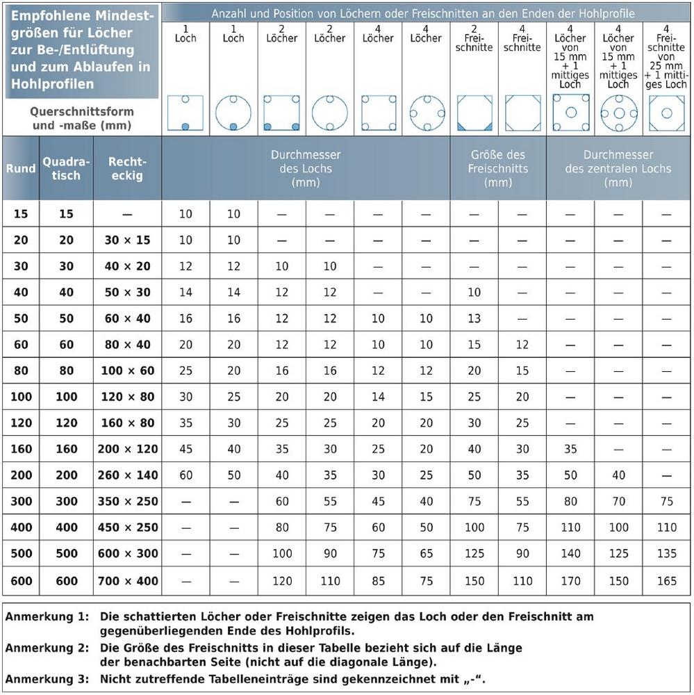 Die in Tabelle A.2 dargestellten Optionen zur Ausführung von Löchern zur Be- und Entlüftung und zum Ablaufen in Hohlprofilen wurden deutlich erhöht (s. Tabelle). So werden für Vierkant-Profile jetzt sieben verschiedene Möglichkeiten und für Rundprofile 4 verschiedene Möglichkeiten der Ausführung dargestellt. Abhängig von der Größe und Querschnittsform des Hohlprofils kann zwischen 1 bis 5 runden Löchern, vier Eckausschnitten oder vier Eckausschnitten mit einer zentralen Bohrung ausgewählt werden. Grundsätzlich wurden die Durchmesser der geforderten Durchflussöffnungen erhöht. So muss beispielsweise ein Quadratprofil mit 80 mm Kantenlänge zukünftig mit einer Bohrung von 25 mm statt bisher 20 mm versehen werden. Die innenliegende Entlüftung von Hohlprofilen, umgangssprachlich als verdeckte Bohrung bezeichnet, ist zu vermeiden, da hier eine Kontrolle seitens der Verzinkerei in der Regel nicht möglich ist.