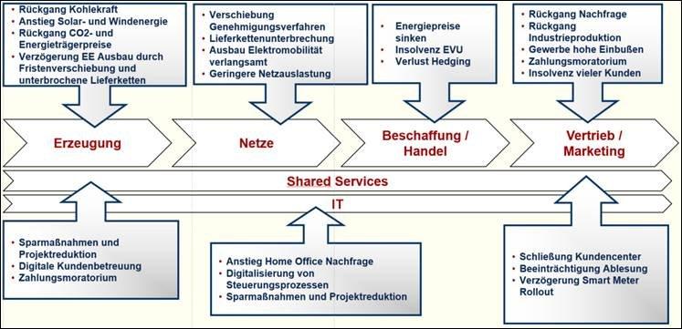 Auch die Energiewirtschaft ist stark von der Coronakrise betroffen und hat in den letzten drei Monaten Verluste auf fast allen Stufen der Wertschöpfungskette verzeichnet. Die Gründe hierfür sind vielfältig: auf allen Ebenen werden Lieferketten unterbrochen, Fristen verschoben und der reguläre Betrieb der Unternehmen beeinflusst. Insolvenzen sowie Zahlungsausfälle stellen Anforderungen an das Forderungsmanagement und den Vertrieb; Zahlungsmoratorien oder die Aussetzung der Insolvenzmeldepflicht verstärken diese. Durch den hohen Produktionsrückgang in der Industrie sinkt die Stromnachfrage, die Netze werden weniger ausgelastet, vorab beschaffte Energiemengen zurückgegeben und der Strompreis fällt, kurzfristig sogar ins Negative. Die Veränderung der Energienachfrage führt zudem zu einem Rückgang des Anteils der Stromerzeugung aus Kohlekraft und einem steigenden Anteil an Erneuerbaren Energien.