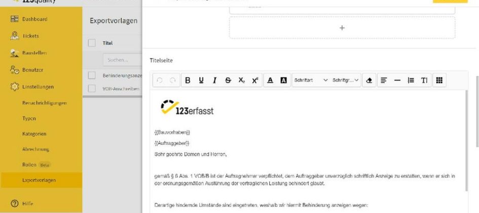 Die Aufgaben- und Mängelmanagement-App 123quality des Lohner Softwarehauses 123erfasst bietet ab sofort zusätzliche Funktionen, die das Arbeiten enorm erleichtern. So erstellt der Anwender mit dem in der App integrierten Editor eine Export-Vorlage, die er wie ein Word-Dokument gestalten kann. In dieses importiert er sein eigenes VOB-konformes Deckblatt inklusive Vor- und Nachdruck, definiert Platzhalter für weitere […]
