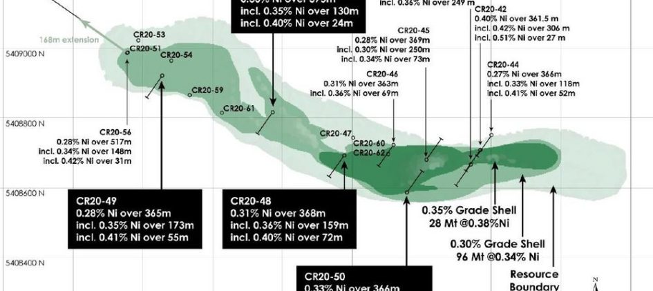 . Die wichtigsten Punkte Alle vier Bohrungen lieferten höhergradige Kernlängen von 130 m bis 175 m mit 0,35 % Nickel. Höhergradige Vererzung von 0,35 % Nickel oder höher wurde jetzt im westlichsten Teil der Main Zone über eine Streichlänge von 600 m durchteuft und bleibt in mehrere Richtungen offen. Drei der vier Bohrungen waren über […]