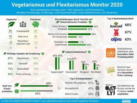 Einer aktuellen repräsentativen Studie zufolge haben bereits 54 Prozent der Flexitarier und 88 Prozent der Vegetarier ein vegetarisches oder veganes Ersatzprodukt gekauft. Jedoch bemängeln Flexitarier und Vegetarier gleichermaßen das Preis-Leistungs-Verhältnis zahlreicher Ersatzprodukte. Das Hamburger Marktforschungsinstitut SPLENDID RESEARCH hat im Juni 2020, im Rahmen einer repräsentativen Umfrage, über sein Online-Panel www.befragmich.de 1.464 in Deutschland lebende Flexitarier […]