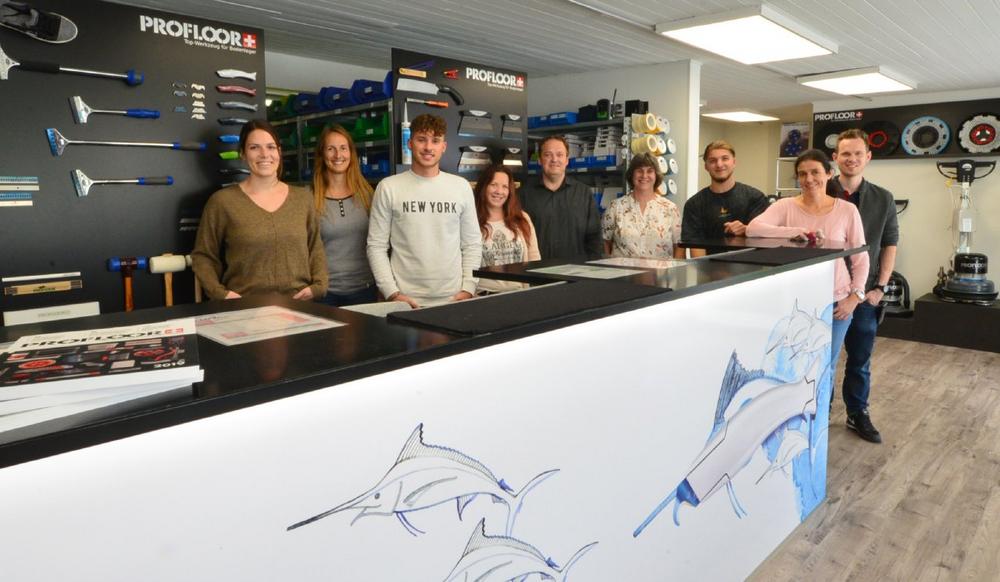 Neben intensivierten online Aktivitäten investiert Profloor auch stark in ihre offline-Präsenz. Anlässlich des Jubiläums wurde der Profloor Shop in Uster neugestaltet und vergrössert. Vier Bodenlegerprofis unter der Führung von Stefan Truttmann bedienen dort alle Anfragen, führen Schulungen durch oder demonstrieren die neuesten Maschinen. Das komplette Profloor Angebot ist vorrätig und kann bequem online oder vor Ort bestellt und abgeholt werden.