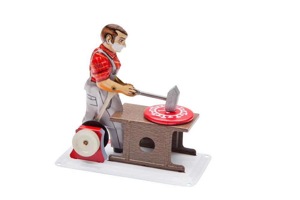 Das Sondermodell zur Corona-Pandemie ist eine Abwandlung des bereits bekannten Hufschmieds, der das Virus langsam, aber sicher, zerschlägt. Natürlich unter strengen hygienischen Auflagen – inklusive Mundschutz!