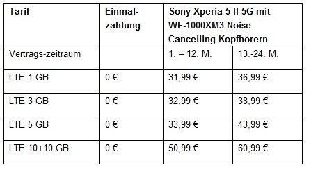 Bei Bestellung eines Sony Xperia 5 II 5G gibt es die Bluetooth-Kopfhörer WF-1000XM3 gratis als Prämie dazu. Diese vereinen branchenführende Geräuschminimierung mit einem atemberaubenden Sound und einem eleganten Design. Die Aktion ist bis einschließlich 19. Oktober befristet und in Kombination mit einem LTE Tarif von yourfone gültig.