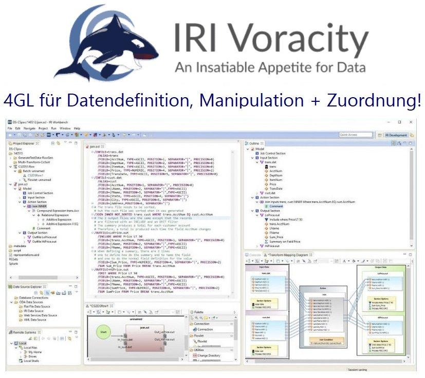 Die Datenmanagement-Plattform IRI Voracity und ihre Produkte IRI Data Manager und die IRI Datenschutz-Suite nutzen dieselben einfachen 4GL-Metadaten für das Layout und die Manipulation der Daten. Im Gegensatz zu den Metadaten in älteren Plattformen sind die Datendefinitionsdatei (DDF), die Mapping-Aufgabe (Jobsteuerung) (.*CL), Skripte, Datenklassen- und Regelbibliotheken und ETL-XML-Projektmetadaten (Flow) zugänglich, explizit, portabel und übergreifend für alle Datenquellen und Plattformen, einschließlich Hadoop.