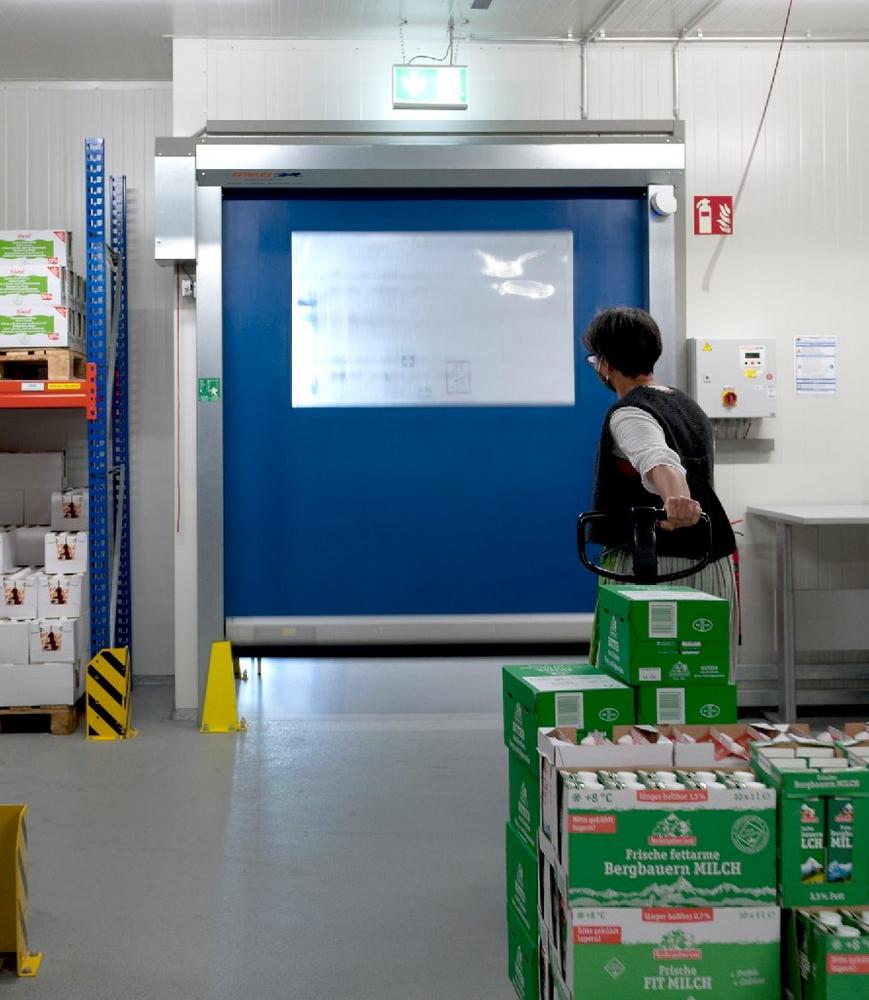 Alle drei Lager werden vollautomatisch betrieben. Zwei der Gebäude sind Kühllager, die auf 4 Grad Celsius temperiert sind. „Wir sind ein in allen Bereichen nachhaltig arbeitender Betrieb“, erklärt Andreas Koch, stellv. technischerLeiter. „Das reicht unter anderem von der Reduzierung des Treibstoffverbrauchs für unsere Milch-LKW durch modernere Fahrzeuge und Routenoptimierung bis hin zum vollständigen Verzicht auf PET-Flaschen und der Verwendung von Kartonverpackungen aus nachwachsenden Rohstoffen. Ganz klar, dass wir auch den Energieaufwand im Sinne des Klimaschutzes für den Betrieb unserer Hochregallager möglichst gering halten.“ Die hervorragend isolierten Spiraltore EFA-SST®-L Premium unterstützen diese Bemühungen der Genossenschaftsmolkerei in jederlei Hinsicht. Sie lassen die Kälte durch ihre sehr guten Isolierlamellen im Gebäude und reduzieren den Kälteverlust durch ihre schnellen Öffnungs- und Schließgeschwindigkeiten sowie durch kürzeste Offenhaltezeiten von zehn Sekunden.