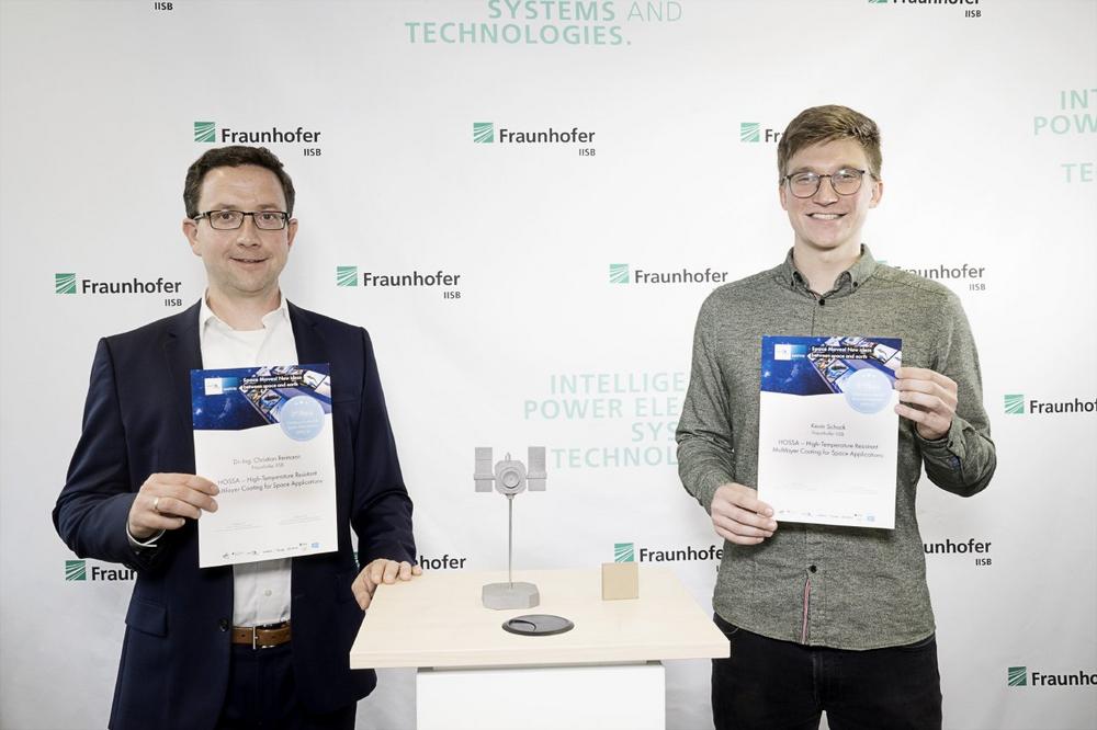 Dr.-Ing. Christian Reimann und Kevin Schuck vom Fraunhofer-Institut für Integrierte Systeme und Bauelementetechnologie IISB in Erlangen wurden für ihre Idee zur Herstellung innovativer Hochtemperaturschutzschichten ausgezeichnet. Herzstück ist dabei die am IISB entwickelte Sprühbeschichtungstechnologie. Diese Technologie ermöglicht es, Bauteile für Luft- und Raumfahrtanwendungen mit ultrahochtemperaturbeständigen Schutzschichten zu versehen.