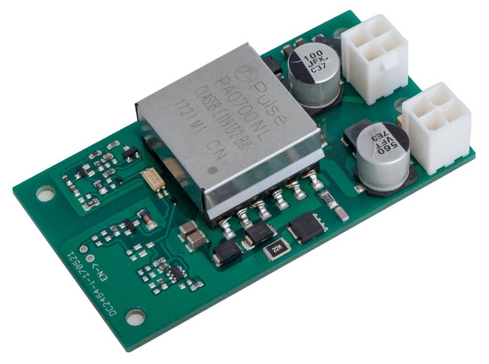 Hochsetzsteller (auch als Boost-Wandler bezeichnet) werden benötigt, um beispielsweise aus der Standard-24-V-DC-Versorgung der Automatisierungstechnik höhere Gleichspannungen von 48 V (z.B. für Antriebstechnik) oder 54 V (z.B. für Power over Ethernet, PoE) zu gewinnen. Die höchste Ausgangsspannung erreicht der DC2475-110-ISO mit 75 VDC; der Maximalstrom liegt dann bei knapp 1,5 A. Bei höherem Leistungsbedarf – oder für redundante Aufbauten – können mehrere Wandler parallelgeschaltet werden. Die Restwelligkeit der Ausgangsspannung liegt unter 150 mVss bei einer Messbandbreite von 20 MHz. Die Isolationsspannung des Übertragers beträgt 1,5 kV.