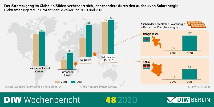 Noch immer sind weltweit 770 Millionen Menschen ohne Zugang zu Strom, vor allem in weiten Teilen Afrikas sowie einigen Ländern in Südasien und Südamerika – aber immerhin rund 250 Millionen weniger als noch im Jahr 2016. Inzwischen liegt im Schnitt die Elektrifizierungsrate in den meisten Regionen bei fast 90 bis 100 Prozent. Nur in Subsahara-Afrika fehlt mehr als der Hälfte der Bevölkerung noch immer der Zugang zu Strom. Dass aber die Elektrifizierung große Fortschritte gemacht hat, ist mittlerweile vor allem der vermehrten Bereitstellung von dezentralen solaren Lösungen zu verdanken. „Technischer Fortschritt und ein erheblicher Kostenrückgang haben im vergangenen Jahrzehnt dazu geführt, dass dezentrale Solarenergie vielerorts eine günstige Option zur Elektrifizierung ist, mit denen insbesondere die abgelegenen ländlichen Gebiete erreicht werden können“, berichtet Studienautor Christian von Hirschhausen.