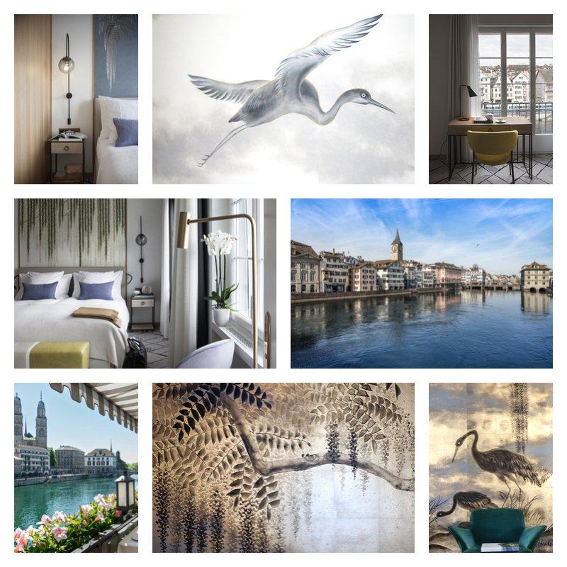 Die Zimmer und Suiten, die dank der privilegierten Lage des Hotels direkt an der Limmat den Blick frei auf das Wasser oder die Stadtkulisse Zürichs geben, basieren auf drei elegant klassischen Farbvariationen. So bieten die neugestalteten Refugien die perfekte Kulisse für ein besonderes Designelement: Die von Hand bemalten, edlen de Gournay Tapeten, die jedes Refugium zu einem Kunstwerk machen, jedes für sich mit ganz eigenem Charme. So spielen sich hier an den Wänden Szenen inspiriert von der Natur ab, denn als Motive haben sich die de Gournay-Künstler den Storchenvogel, Trauerweiden und Glyzinien, die rund um den Zürichsee zu finden sind, als Vorlage genommen. Den Kontrast dazu bilden die im Vintage-Stil gehaltenen Möbel wie Chaiselongues, Sessel, Schreibtische und Tische in herausstechenden Tönen, die spannende Akzente setzen. Auch das Lichtkonzept in den Zimmern ist an das geschmackvolle Retro-Konzept angelehnt: Durch ihre kunstvollen Formen werden die Lampen zum Hingucker und unterstreichen gleichzeitig das wohnliche Ambiente.