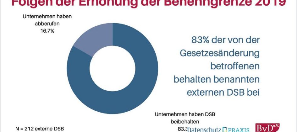 Ein Jahr ist vergangen, seit der Gesetzgeber die Grenze der Pflicht, einen Datenschutzbeauftragten (DSB) zu benennen, von 10 auf 20 datenverarbeitende Mitarbeiter hochgesetzt hat. Die Folgen für Unternehmen und DSB hat nun die Ruhr-Universität Bochum im Auftrag des Berufsverbands der Datenschutzbeauftragten Deutschlands (BvD) e.V. und der Zeitschrift Datenschutz PRAXIS in einer Umfrage mit insgesamt 353 […]