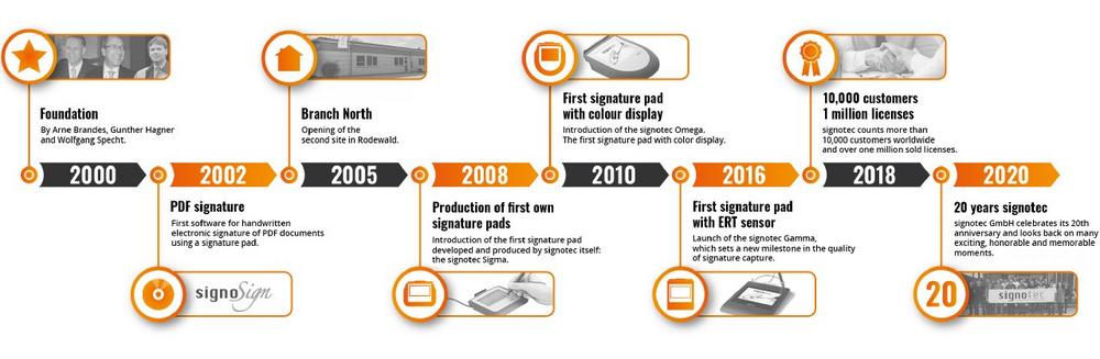 In December 2020 signotec GmbH looks back proudly on a 20-year success story. Founded in 2000 by Arne Brandes, Gunther Hagner and Wolfgang Specht as a software manufacturer for applications for electronic handwritten signature verification as well as electronic signature of documents. During these past 20 years, signotec has developed not only into a manufacturer of its own hardware and software, but also far beyond that into a technology leader in the field of capturing handwritten electronic signatures.
