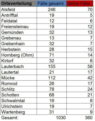 Am Dienstag meldet das Gesundheitsamt des Vogelsbergkreises neun Neu-Infektionen mit dem Corona-Virus im gesamten Kreisgebiet. Insgesamt steigt die Zahl der positiven Fälle im Kreisgebiet auf 1030. Weiterhin sind vier neue Todesfälle zu verzeichnen: Ein 81-, ein 84-, und ein 86-Jähriger sowie eine 97-Jährige sind im Zusammenhang mit einer Corona-Infektion verstorben. Aktuell betreut die Behörde 360 […]