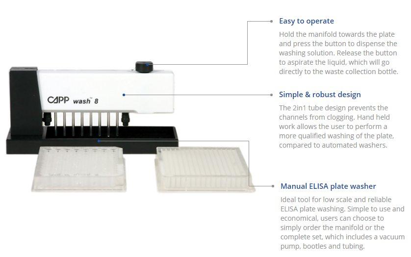 Most laboratories running ELISA require one or more high-efficiency ELISA washers for quicker processing of 8-strip tubes or 96- and 384-well plate formats. While automatic ELISA plate washers may be convenient, the prohibitive cost of purchase makes the decision to procure one difficult to justify for small labs that may not need an automated ELISA washer station. CAPPTronic electronic pipettes and CAPPWash manual ELISA plate washers offer an economic alternative to automated ELISA washers without sacrificing quality.