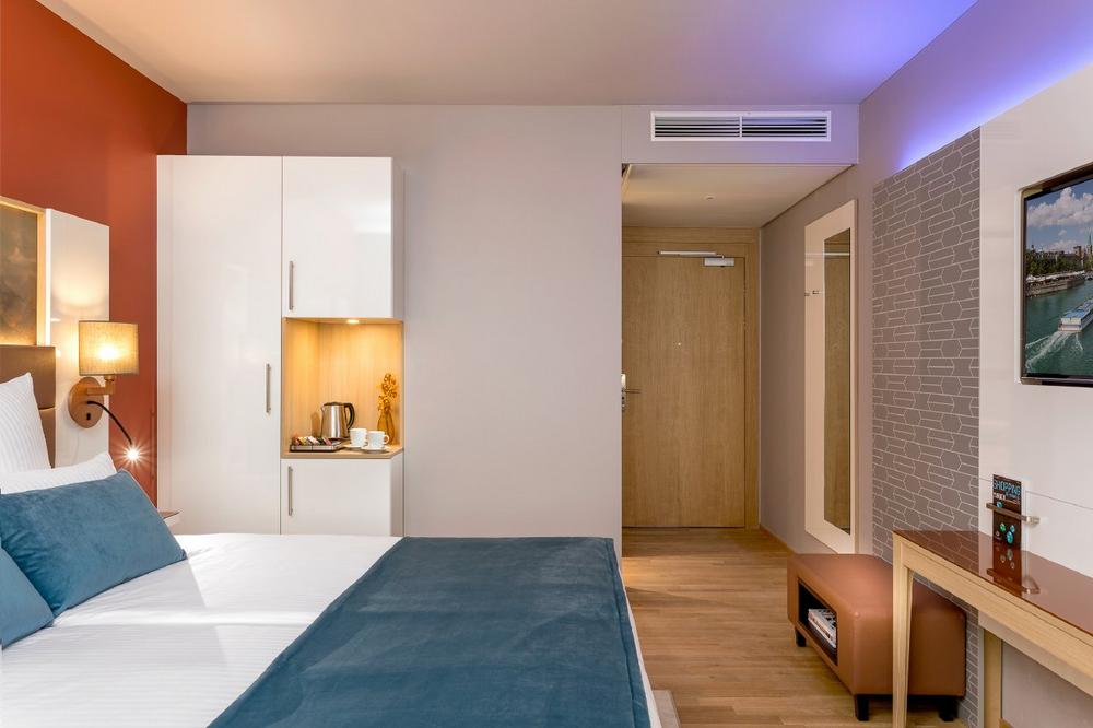 Das Hotel verfügt auf vier Etagen über 116 Comfort Zimmer, vier davon mit Longstay-Ausstattung. Das hochwertige Interieur mit Eichenholz-Parkett, Bodenheizung und elektrischer Verdunkelung wird mit einem hellen Design ergänzt. Dabei widmete sich Hotel Interior Designer Andreas Neudahm thematisch Zürich, der Schweiz und dem Fliegen. So ziehen sich lokale Besonderheiten und regionale Ikonen als roter Faden durch das gesamte Designkonzept: ein in Szene gesetztes Kuhfell an der Rezeption, ein Hirschgeweih aus Porzellan oder das Bild einer Bergkette in den Hotelzimmern. Weiße Möbel vor hellblauen Wänden erinnern an Wolken am Himmel. Das Open Lobby-Designkonzept verbindet auch hier ideal Lobby, Bar und Restaurant in einer weiten Fläche. Ein besonderes Highlight ist die großzügige Terrasse mit Lounge im Innenhof – der ideale Rückzugsort, um die Arbeit nach draußen zu verlagern oder den Abend bei einem guten Glas Schweizer Wein ausklingen zu lassen. Das gastronomische Angebot umfasst passend zum kosmopolitischen Flair des Flughafens eine Weltküche, die für jeden Geschmack etwas bereithält.