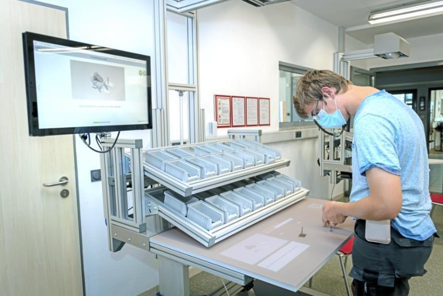 Das Ergebnis sind acht Montagearbeitsplätze in unterschiedlichen Variationen, deren vom wertkreis konstruierten und gebauten Arbeitstische sich individuell, zum Beispiel für Rollstuhlfahrer*innen, anpassen lassen. Das Besondere: Das System eignet sich sowohl zur Unterstützung im betrieblichen Umfeld als auch in der Aus- und Weiterbildung und dient somit als wertvolle Brücke bei der Integration in den Arbeitsmarkt. Darüber hinaus zeichnet sich das Montagesystem durch geringe Einarbeitungs- und Umrüstzeiten aus, was insbesondere bei Aufträgen mit hoher Variantenvielfalt und kleineren Produktionsvolumina zum Tragen kommt. Es ist in der Lage, viele Menschen mit unterschiedlichen Beeinträchtigungen zu unterstützen, da die Inhalte und Assistenzfunktionen an die Bedürfnisse und Fähigkeiten individuell angepasst werden können. Während die NutzerInnen schnell und unkompliziert an die Arbeitsinhalte herangeführt und idealerweise für den Eintritt in den Arbeitsmarkt qualifiziert werden können, kommt die Konfiguration des Systems und der Inhalte ohne externe Kompetenzen bzw. Programmieraufwand aus.