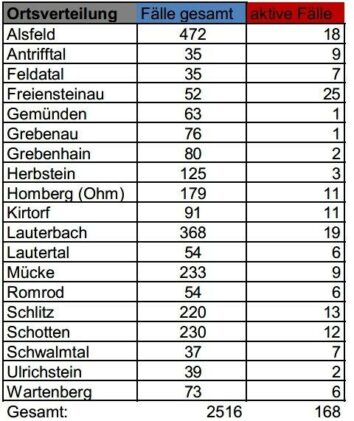Für den Sonntag meldet das Gesundheitsamt des Vogelsbergkreises 13 Neuinfektionen mit SARS-CoV-2. Diese sind über das gesamte Kreisgebiet verteilt. Insgesamt weist die Statistik für den Vogelsbergkreis seit Beginn der Corona-Pandemie 2516 Fälle aus. Aktuell betreut die Behörde 168 aktive Fälle. Für das Kreisgebiet meldet das Robert-Koch-Institut eine Sieben-Tages-Inzidenz von 54,0 aus. Die Übersicht für den […]