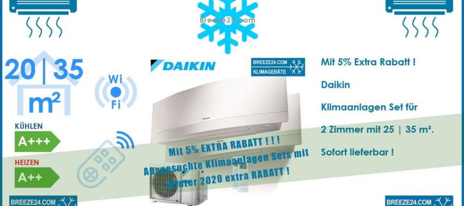 Jetzt kaufen mit 5% Winter Rabatt ! ! ! Daikin Klimaanlagen Set für 2 Zimmer mit je 25 | 35 m² Daikin Klimaanlagen Set 2 x Wandgeräte Emura – 2,4/3,5 kW – FTXJ25MW + FTXJ35MW + Außengerät 2MXM40M für 2 Zimmer mit 25 | 35 m² Fläche Innengräte Daikin Wandgeräte Emura FTXJ25MW | FTXJ35MW Bemerkenswerte […]