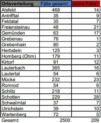 Am Freitag meldet das Gesundheitsamt des Vogelsbergkreises zehn bestätigte SARS-CoV-2-Nachweise. Diese sind auf verschiedene Städte und Gemeinden im Kreisgebiet verteilt. Insgesamt weist die Statistik seit Beginn der Pandemie 2500 bestätigte Corona-Infektionen im Vogelsbergkreis aus. Aktuell betreut die Behörde 209 aktive Fälle. Für das Kreisgebiet verzeichnet das Robert-Koch-Institut eine Sieben-Tages-Inzidenz von 58,7. Die Übersicht für den […]