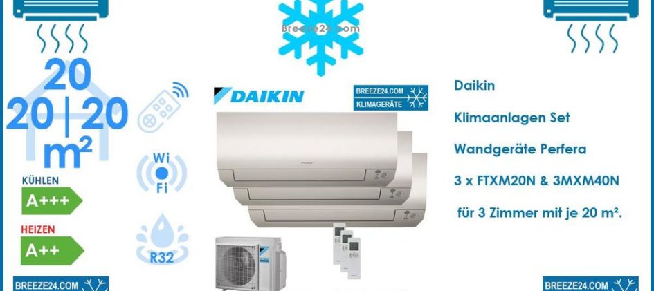 Daikin Klimaanlagen Set für 3 Zimmer mit je 20 m² | A+++ | A++ Daikin Klimaanlagen Set Wandgeräte Perfera 2,0 kW 3 x FTXM20N + 3MXM40N R32 für 3 Zimmer mit je 20 m² Innengerät Daikin Perfera Wandgerät FTXM20N Attraktives Design in Wandmontage mit perfekter Raumluftqualität. Dieses Gerät verkörpert die Zukunftsvision von Daikin bei der […]