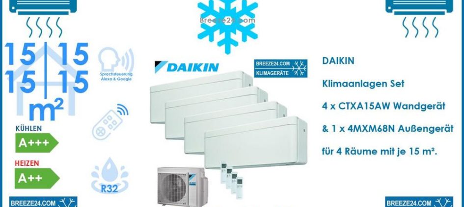 Daikin Klimaanlagen Set 4 x Wandgeräte Stylish CTXA15AW + 4MXM68N R32 für 4 Räume mit je 15 m²