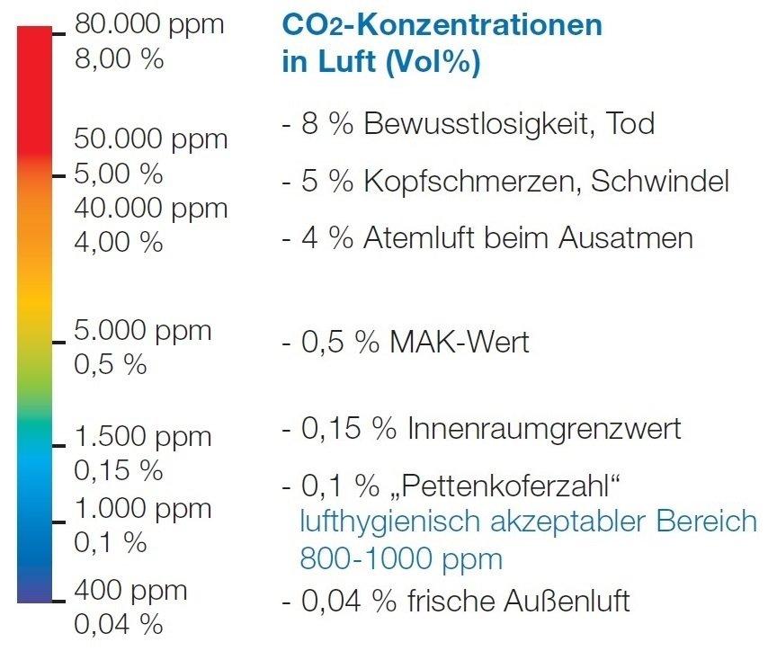 1.000 ppm (parts per million) CO2 als Richtwert für die CO2-Konzentration in Wohn- und Aufenthaltsräumen wurden bereits 1858 von dem Hygieniker Max von Pettenkofer vorgeschlagen. Diese Konzentration korreliert grob mit der Geruchsintensität menschlicher Ausdünstung sowie etwa mit der Menge eines Teils flüchtiger organischer Verbindungen (VOC’s). So wie der vom Menschen verunreinigte Luftanteil in Räumen steigt, erhöhen sich auch die Konzentrationen von Luftschadstoffen aus den Baumaterialien, Einrichtungsgegenständen und Haushaltschemikalien (z. B. Gerüche, Allergene, Biozide, Tabakrauch, VOC, krebserzeugendes Formaldehyd). Wie die jüngsten wissenschaftlichen Studienergebnisse zeigen, besteht auch ein Zusammenhang zwischen steigender CO2-Konzentration in der Umgebungsluft und signifikanten Defiziten bei der kognitiven Leistungsfähigkeit.
