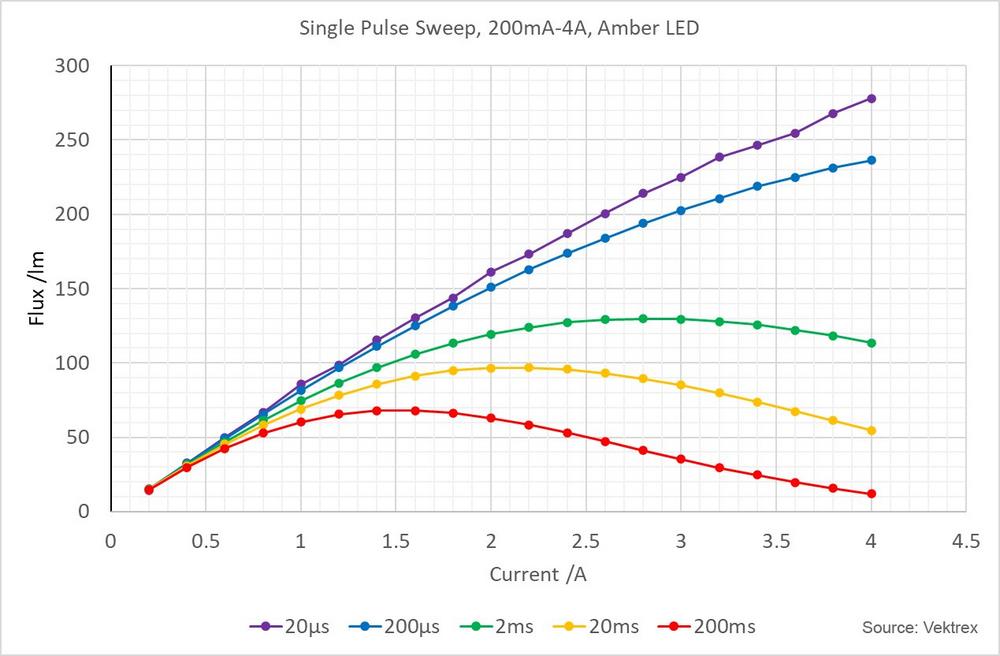 Neuere Applikationen in den Bereichen Automotive Lighting oder Machine Vision setzen auf moderne LEDs, die möglichst klein sind und eine hohe Leuchtdichte haben. Um diese minimale Größe kostenlimitiert herzustellen, werden wärmeverteilende Elemente auf ein Minimum reduziert oder sogar vollständig gestrichen. Zur Charakterisierung von LEDs in der Entwicklung und Produktion verwendete die Industrie in den letzten Jahren ein Long-Pulse-Verfahren zur Bestimmung der L-I-Kurve (Lichtausbeute-Strom). Hierbei wird der Strom nach IES LM-85 Standard über mehrere Millisekunden an die LED angelegt. Bei den modernen High-Power-LEDs (d.h. LEDs mit hohen Stromdichten) kommt es über diesen langen Zeitraum aufgrund der fehlenden Kühlung jedoch zu einer nicht mehr zu vernachlässigenden Erwärmung. Diese nicht konstante Junction-Temperatur während des Tests führt zu einer abnehmenden Lichtausbeute und damit zu einer verfälschten Messkurve.