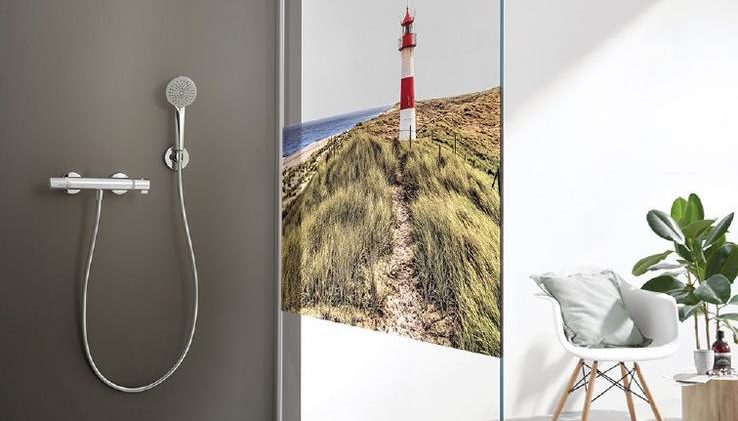 Bunter Motivdruck als Sichtschutz in der Walk-in Dusche – auf beiden Seiten gleich schön