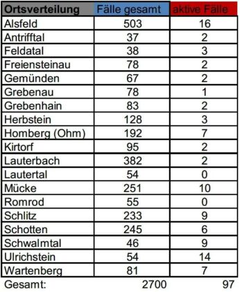 Wie das Gesundheitsamt des Vogelsbergkreises mitteilt, gingen bei der Behörde zehn Neuinfektionen mit SARS-CoV-2 ein. Diese sind über das gesamte Kreisgebiet verteilt. Damit liegt die aktuelle Gesamtzahl der Fälle im Kreisgebiet bei 2700. Vier Menschen meldeten sich bei der Behörde als genesen, damit werden 97 aktive Fälle vom Gesundheitsamt betreut. Bei weitergehenden Laboruntersuchungen wurde in […]