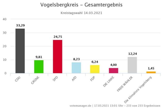Wie der Kreiswahlleiter in der Kreisverwaltung des Vogelsbergkreises mitteilt, steht das vorläufige amtliche Endergebnis für die Kreistagswahl der 12. Wahlperiode des Kreistages fest. Acht Wahllisten mit insgesamt 323 Kandidatinnen und Kandidaten waren angetreten, nun sind die 61 Sitze im Kreistag verteilt – alle acht zur Wahl angetretenen Listen sind vertreten. Mit insgesamt 33,29 Prozent der […]
