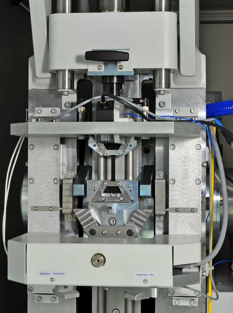 In the developed rotational impact tester, a 300 kg rotating flywheel mass takes over the speed preselection and energy storage. However, other rotating masses can also be realized. For the actual test, the energy is transferred to a linear slide with the integrated specimen holder. The actual tensile test then takes only a few milliseconds. Compared to other technologies, with which equally dynamic tests are carried out (like pendulum impact testers, drop testers or high-speed testing machines), the rotational impact tester stands out due to its high testing speed and its high impact energy, at a comparatively small machine size.