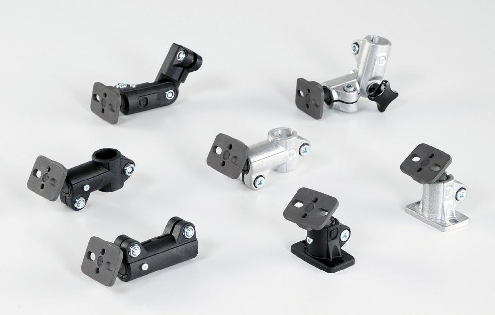Für die flexible Anbindung besitzen alle neuen Kugelklemmstücke eine um 360° drehbare Universalanschlussplatte mit zwei Langlöchern und zwei Gewinden. Der Schwenkbereich der Anschlussplatten beträgt jeweils 60°. Die Klemmelemente lassen sich frei einstellen und leicht fixieren. Damit eignen sie sich ideal für die Konstruktion flexibler Rohrkonstruktionen sowie für die Befestigung von Sensoren, Reflektoren und anderen Elementen, die je nach Fertigungsanforderung und Produkt häufiger präzise ausgerichtet oder nachjustiert werden müssen. Eine spezielle Oberflächenbeschichtung des Kugelgelenks sorgt dabei für eine hochfeste Klemmung.