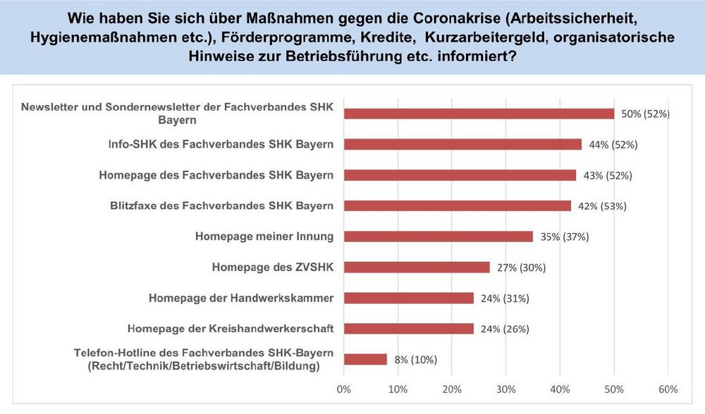 Das Informationsverhalten der Betriebe hat sich auf hohem Niveau stabilisiert. Nach wie vor geben zwischen 40 und 50 % der Betriebe an, sich hauptsächlich aus Medien des Fachverbandes wie zum Beispiel dem Newsletter, Sondernewsletter der Info SHK oder der Homepage des Fachverbandes SHK Bayern zu informieren. Ein eindeutiger Trend geht hierbei zu digitalen Medien (Newsletter und Homepage).