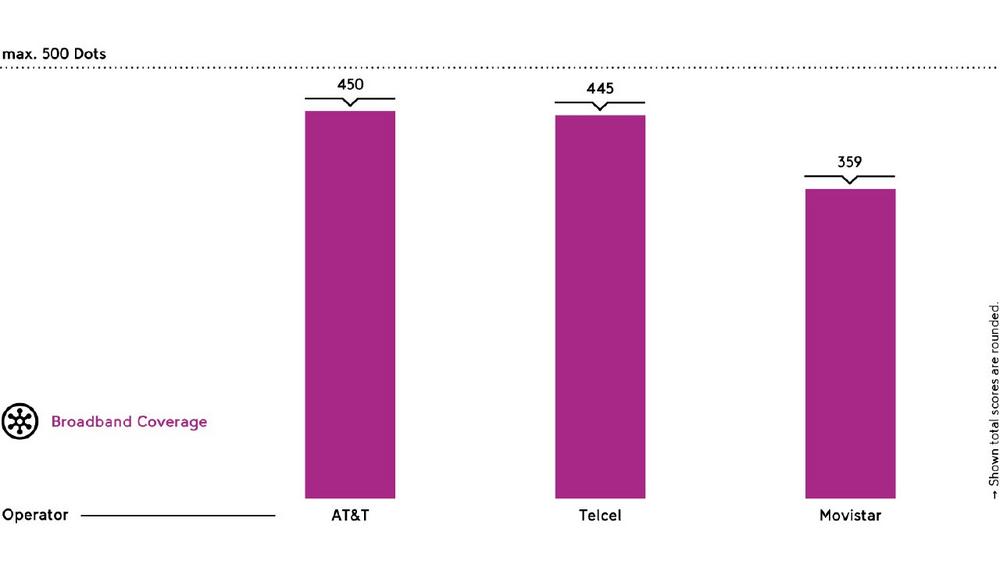Aachen; April 26, 2021 – umlaut, the global consultancy company and world leader in network testing and benchmarking, has analysed the three Mexican mobile networks of AT&T, Telcel and Movistar with regards to mobile broadband coverage. Applying the umlaut methodology, which is acknowledged as the global de-facto industry standard, umlaut conducted a crowd sourced analysis and the results show AT&T in the lead – achieving the best rated Broadband Coverage in Mexico. With a score of 450 out of a maximum of 500 points, AT&T shows the highest score overall. Telcel follows second with a score of 445 points while Movistar ranks third with an overall score of 359 points.