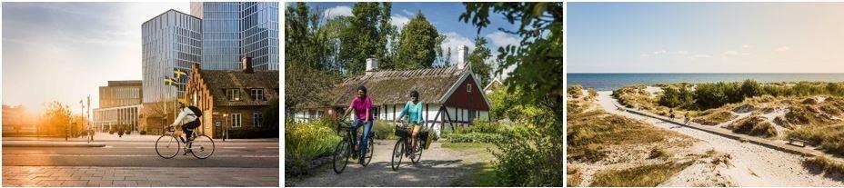 Auf den sechs Etappen der Südküstenroute bilden naturschöne Landschaften und kulturreiche Städte einen spannenden Mix. Radler durchfahren in Simrishamn und Ystad das Mittelalter, unternehmen auf der Festung Trelleborg einen Ausflug in die Wikingerzeit und stoßen auf Weingütern oder an einem der schönsten Strände Schwedens, Sandhammaren, auf die Gegenwart an. Traditionelle Fischerdörfer wie Kåseberga, liegen ebenso auf dem Weg wie zahlreiche Einkehr- und Shoppingmöglichkeiten, in denen lokale und regionale Unikate angeboten werden. Ohne Smygehuk würde der Sydkustleden seinem Namen nicht gerecht werden, denn an diesem Hafen befinden sich Besucher am südlichsten Festlandpunkt Schwedens. Eine besondere Hafenerscheinung ist auch der Westhafen in Malmö. Dieses Viertel mit seiner außergewöhnlichen Architektur beheimatet unter anderem das Wahrzeichen der Hauptstadt Skånes: Das Turning Torso Hochhaus. Malmö ist nicht nur eine der Top-10-Fahrradstädte der Welt, sondern mit ihrer Restaurant- und Museumsvielfalt auch ein Hotspot für Foodies, Kunst- und Kulturliebhaber. Auf den letzten beiden Abschnitten steht neben historischen Erkundungen auch wieder die Natur im Vordergrund. Sandstrände, Schwedens älteste Gartenkolonie, die pittoreske Insel Ven im Öresund und das Naturschutzgebiet Hilleshögs Dalar am Stadtrand von Landskrona leisten ihren Beitrag zur charakteristischen Kulisse. In Helsingborg wird die Tour kontrastreich beendet: Die Hafenstadt begeistert nämlich nicht nur mit ihrem historischen Zentrum und der umliegenden Natur, sondern belegt mit seinen zukunftsweisenden Projekten auch einen der vordersten Plätze bei der Wahl zur „Europäischen Innovationshauptstadt 2020“.