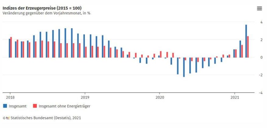 Die Erzeugerpreise gewerblicher Produkte waren im März 2021 um 3,7 % höher als im März 2020. Wie das Statistische Bundesamt (Destatis) weiter mitteilt, war dies der höchste Anstieg gegenüber dem Vorjahresmonat seit November 2011 (+4,6 %). Gegenüber dem Vormonat stiegen die gewerblichen Erzeugerpreise um 0,9 %. Hauptverantwortlich für den Anstieg der gewerblichen Erzeugerpreise gegenüber März 2020 war die Preisentwicklung bei Energie und […]
