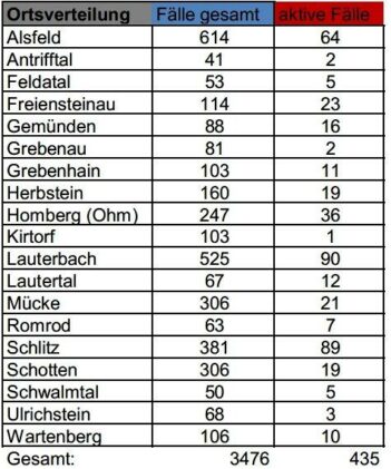 Am Sonntag meldet das Gesundheitsamt des Vogelsbergkreises 36 bestätigte Neuinfektionen mit SARS-CoV-2. Die Neuinfektionen sind über das gesamte Kreisgebiet verteilt. Damit steigt die Gesamtzahl der Corona-Infektionen seit Beginn der Pandemie auf 3476. Aktuell betreut die Behörde 435 aktive Fälle. Für das Kreisgebiet weist das Robert-Koch-Institut eine Sieben-Tages-Inzidenz von 228,1 aus. Hessenweit liegt der Wert bei […]