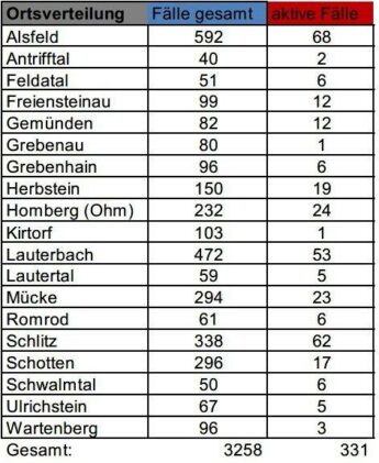 Am Dienstag meldet das Gesundheitsamt des Vogelsbergkreises insgesamt neun Neuinfektionen mit SARS-CoV-2. Diese sind über das gesamte Kreisgebiet verteilt. Insgesamt gibt es seit Beginn der Corona-Pandemie im Vogelsbergkreis somit 3258 Fälle. Aktuell betreut die Behörde 331 aktive Fälle – im Lauf der Woche meldeten sich bisher 53 Personen als genesen. Für den Vogelsbergkreis weist das […]