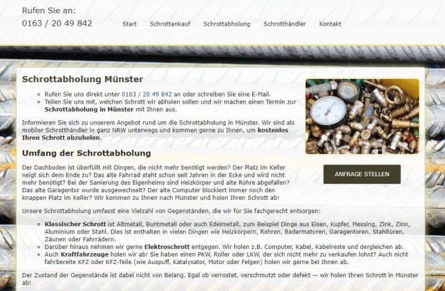 . Es werden alle Services rund um das Thema Metallschrott von der Demontage bis zur ordnungsgemäßen Entsorgung angeboten Die Schrottabholung Münster ist täglich im Ruhrgebiet und ganz NRW unterwegs, um Metallschrott von Privatpersonen und Unternehmen einzusammeln. Dafür stehen spezielle Fahrzeuge zur Verfügung, die ein effizientes Arbeiten und damit eine kurze Verweildauer beim Kunden ermöglichen. Ziel ist […]