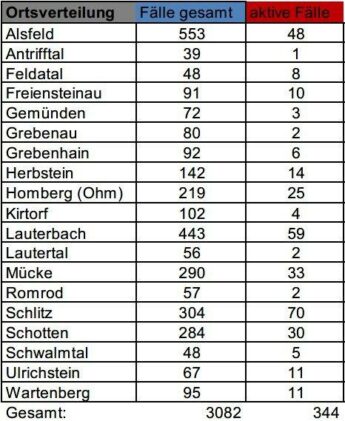 . Das Gesundheitsamt des Vogelsbergkreises verzeichnet am Mittwoch 31 neue Fälle von SARS-CoV-2. Die Gesamtzahl der Fälle steigt seit Beginn der Corona-Pandemie auf 3082. Zurzeit betreut die Behörde 344 aktive Fälle. Laut Robert-Koch-Institut liegt die Sieben-Tages-Inzidenz für den Vogelsbergkreis bei 140,1. Für Hessen liegt der Wert bei 119,7. Die Übersicht für den Vogelsbergkreis: Fälle gesamt: […]