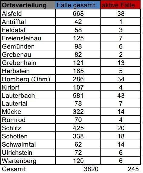 Insgesamt schlagen damit seit Beginn der Corona-Pandemie 3820 Fälle im Vogelsbergkreis zu Buche.