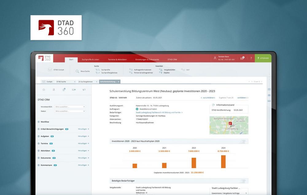 Mit Launch des Moduls „Investitionsvorhaben“ erweitert das Unternehmen seine Vertriebsplattform DTAD 360 um eine neue Art der Lead-Information, die die bisherigen Module „Öffentliche Ausschreibungen”, „Gewerbliche Bauvorhaben”, „Firmen & Vergabestellen” und „Gebäudedatenbank” optimal ergänzt.